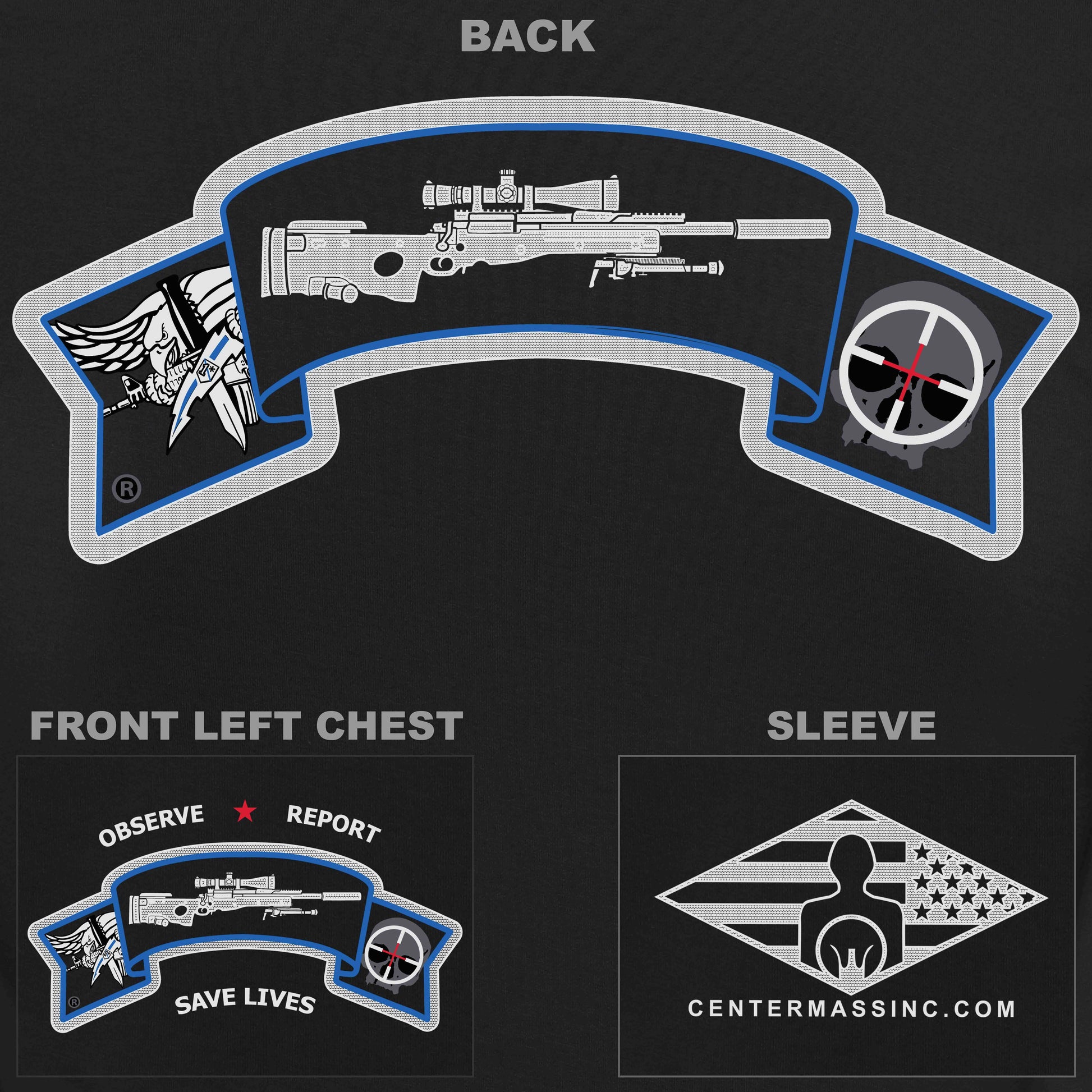 The iconic Police Sniper Qualification insignia is located on the left chest (4.75 x 2”) and across the back of the shirt. The ribbon in both locations includes a blue line honoring the profession. The right sleeve depicts the U.S. flag, stars forward, within our company’s diamond shaped logo.