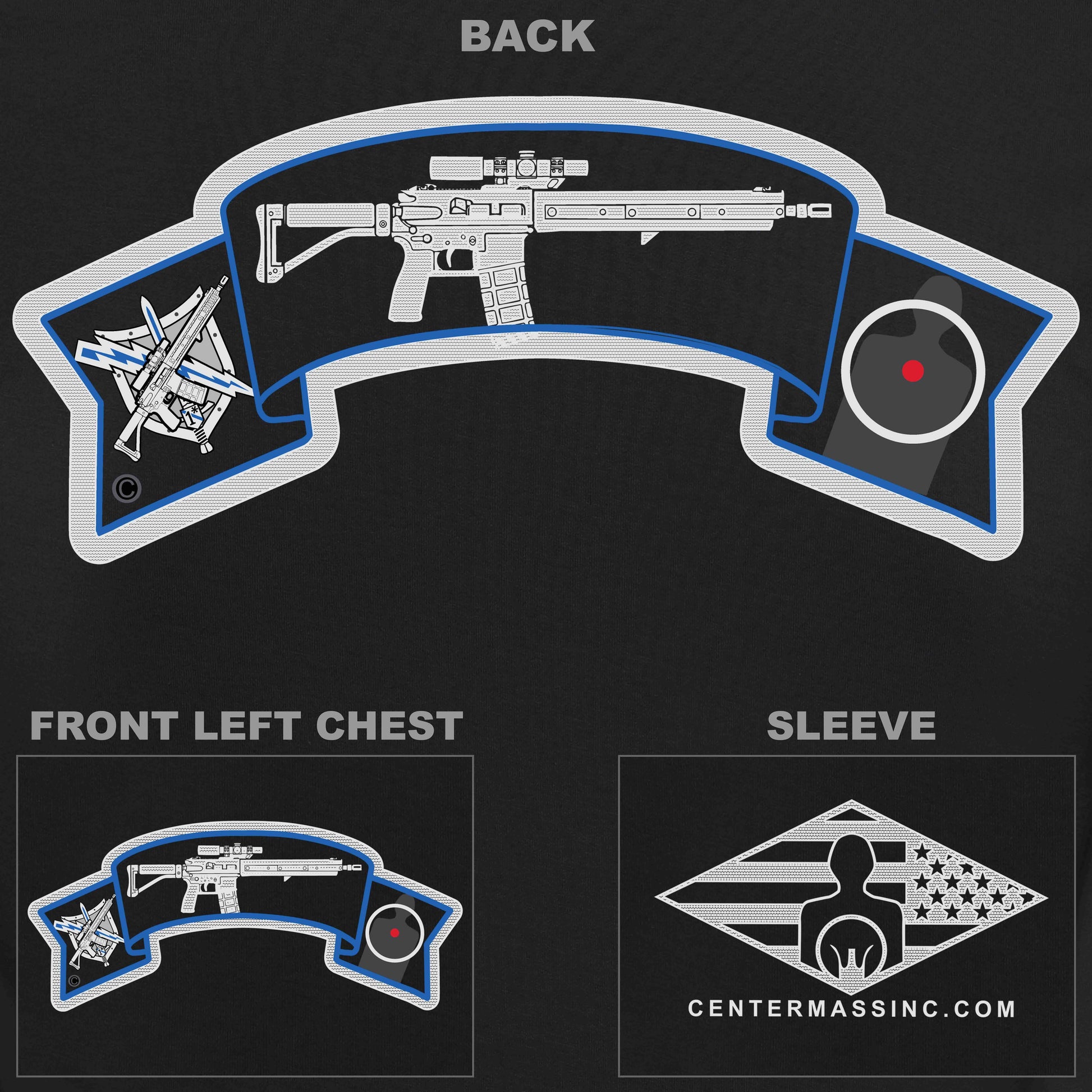 The iconic Patrol Rifle Qualification insignia is located on the left chest (4.75 x 2”) and across the back of the shirt. The ribbon in both locations includes a blue line honoring the profession. The right sleeve depicts the U.S. flag, stars forward, within our company’s diamond shaped logo.