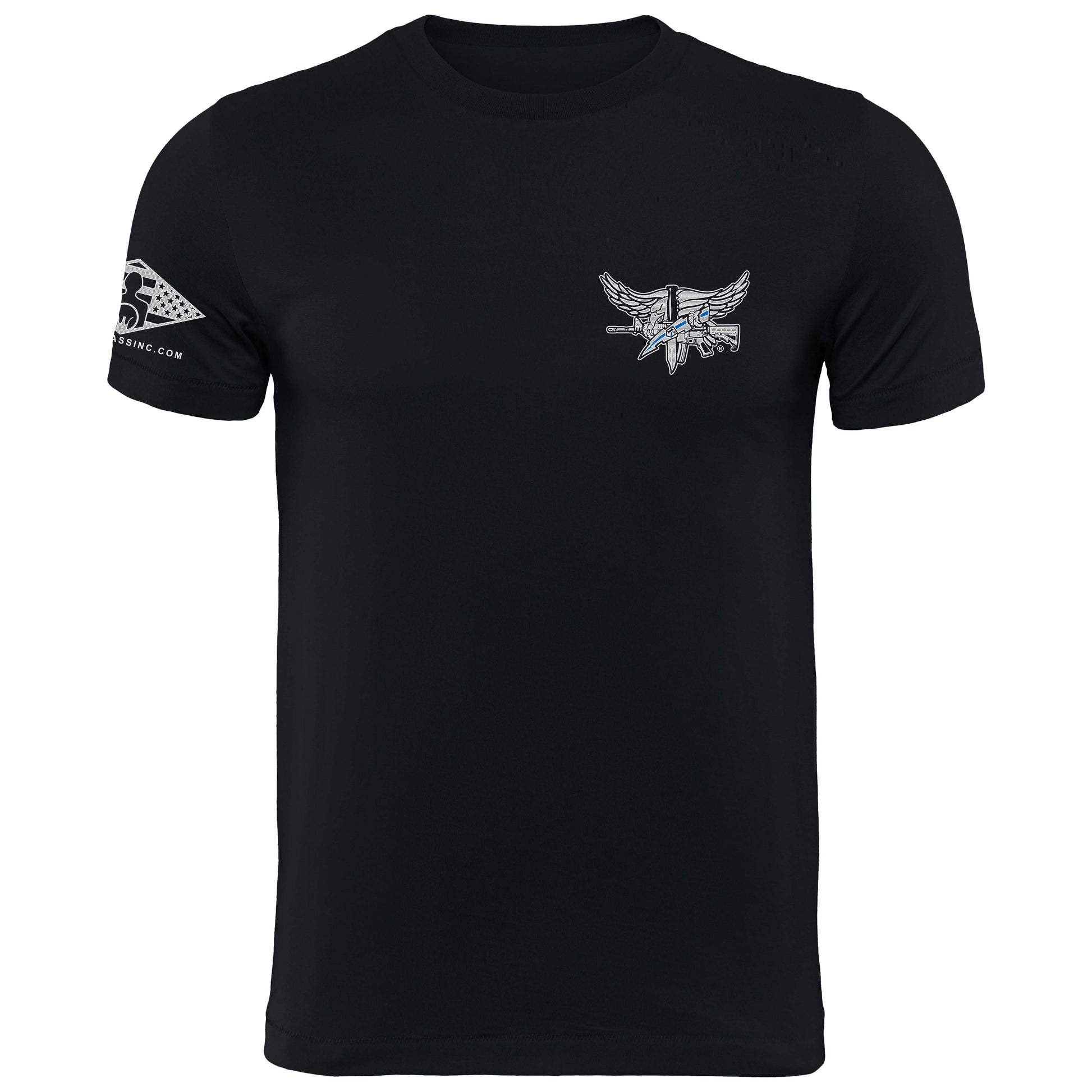The iconic SWAT Operator insignia is located on the left chest (4” x 3”) and across the entire back of the shirt (11” x 7.5”). The lightning bolt in both locations includes a blue line honoring the law enforcement profession. The right sleeve depicts the U.S. flag, stars forward, within our company’s diamond shaped logo.
