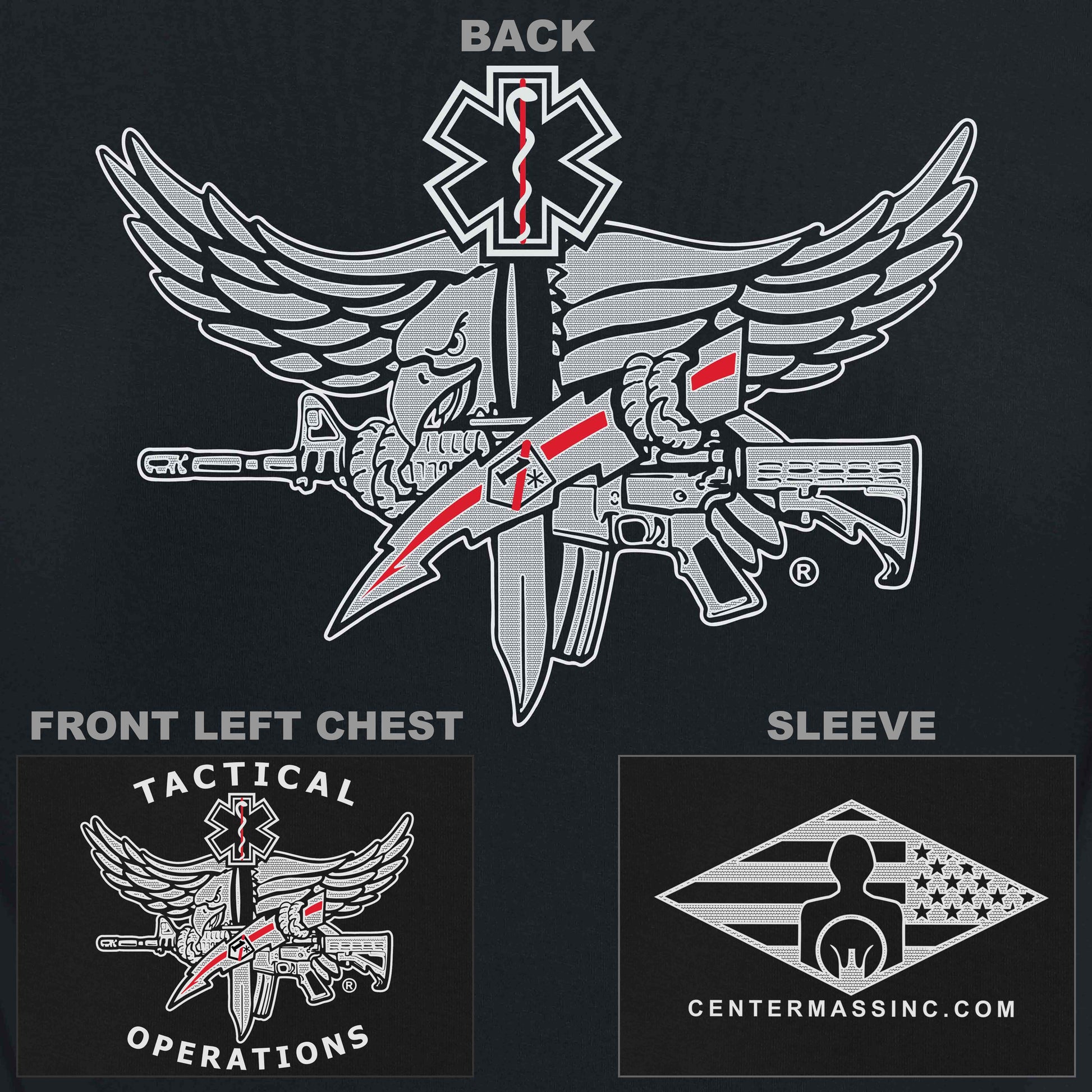 The iconic SWAT Medic insignia is located on the left chest (4” x 3”) and across the entire back of the shirt (11” x 7.5”). The lightning bolt in both locations includes a red line honoring the profession. The right sleeve depicts the U.S. flag, stars forward, within our company’s diamond shaped logo.