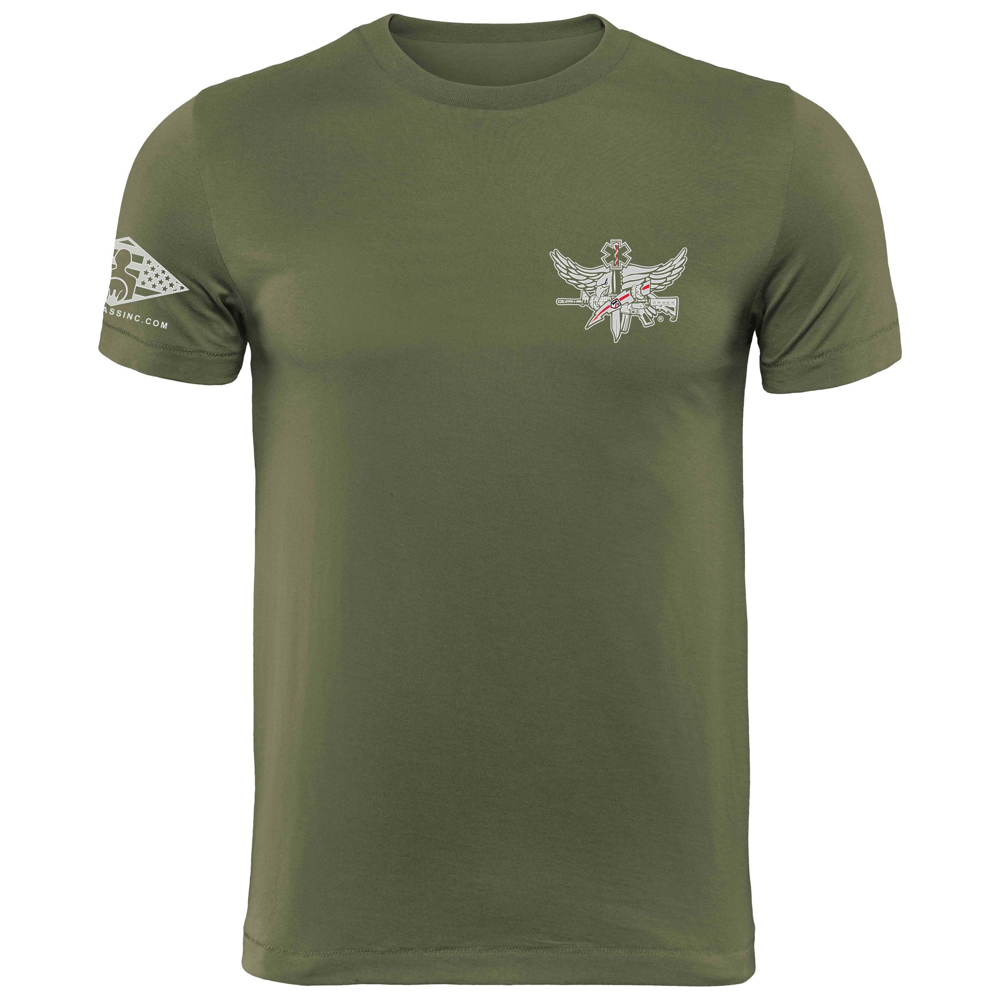 The iconic SWAT Medic insignia is located on the left chest (4” x 3”) and across the entire back of the shirt (11” x 7.5”). The lightning bolt in both locations includes a red line honoring the profession. The right sleeve depicts the U.S. flag, stars forward, within our company’s diamond shaped logo.