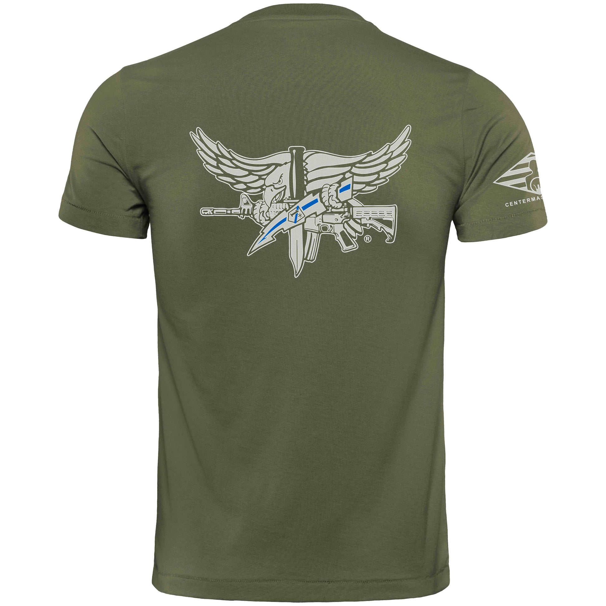The iconic SWAT Operator insignia is located on the left chest (4” x 3”) and across the entire back of the shirt (11” x 7.5”). The lightning bolt in both locations includes a blue line honoring the law enforcement profession. The right sleeve depicts the U.S. flag, stars forward, within our company’s diamond shaped logo.