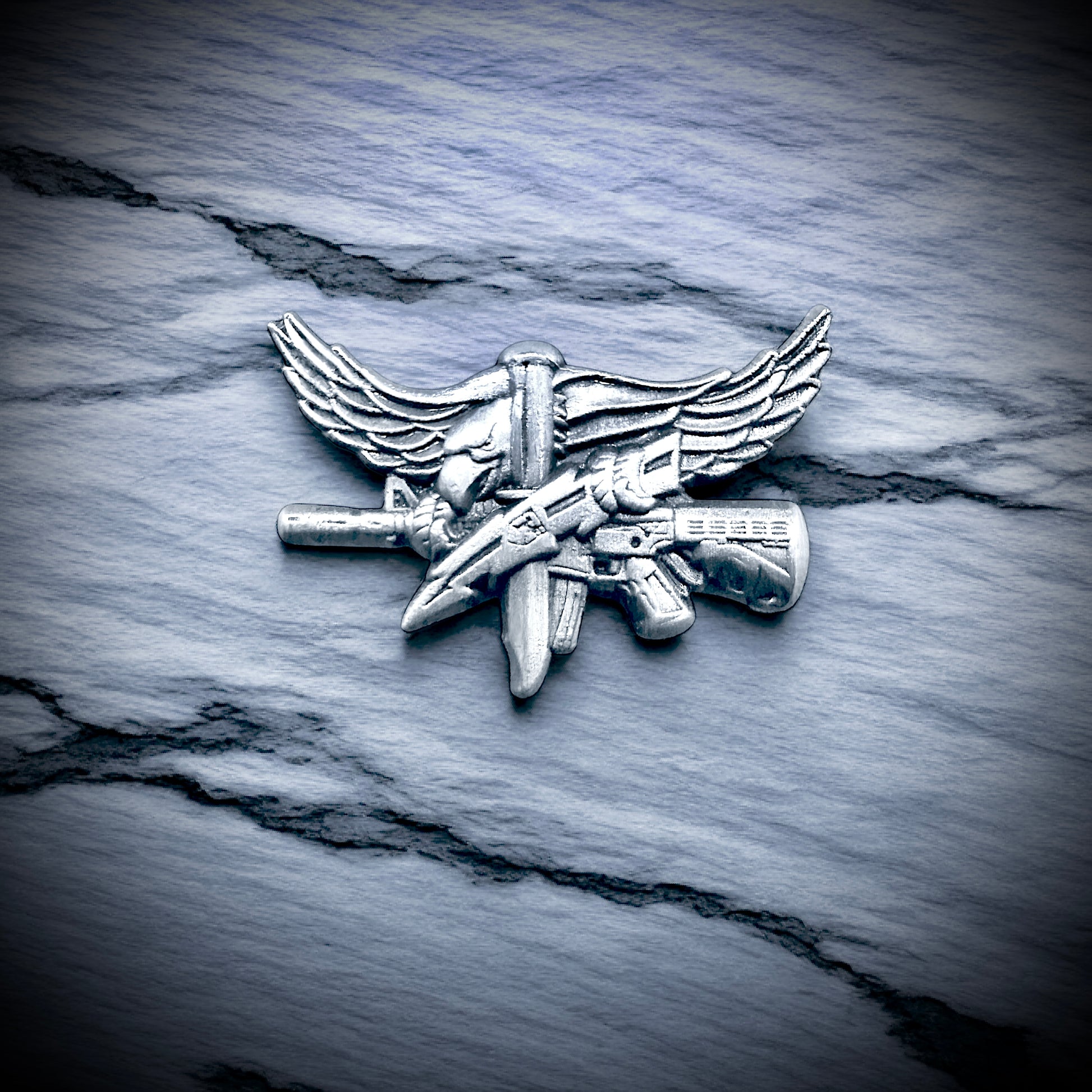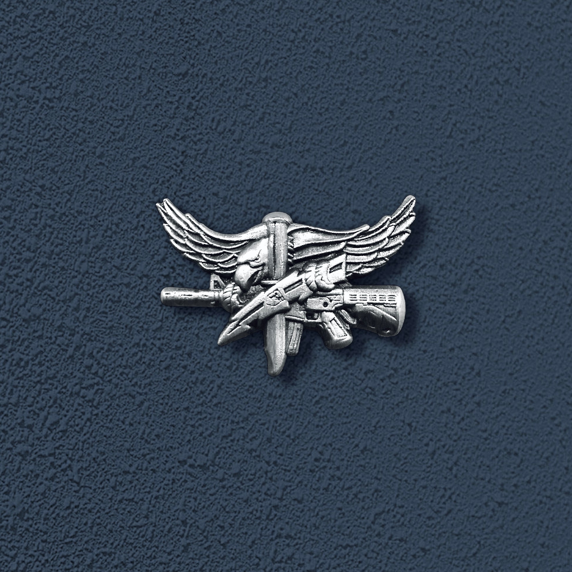 The SWAT Operator Lapel Pin in Antique Silver. The picture shows the pin in relation to the regular size Operator Pin. It only has one post and a non spin "mini" post to keep it in place. The size is 1" wing tip to wing tip and 3/4 of an inch high.